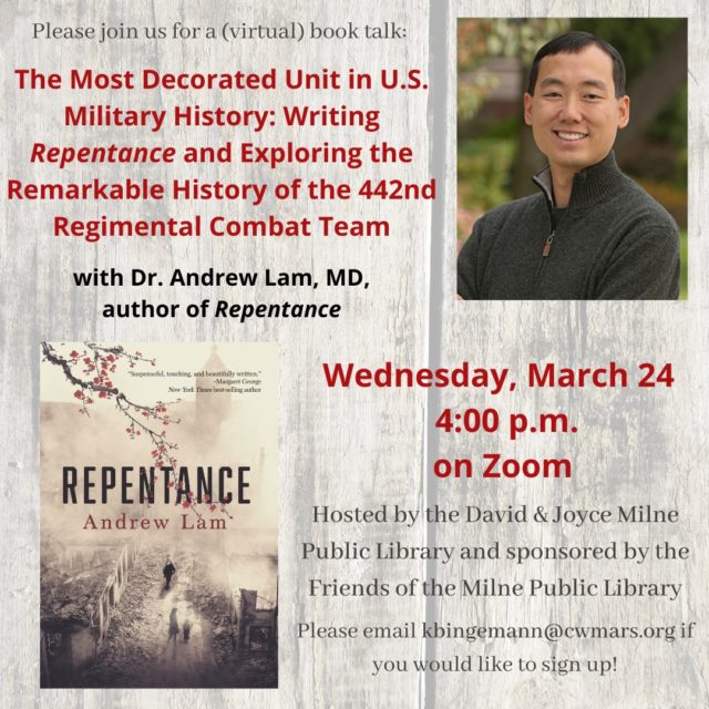 Dr. Andrew Lam is an award-winning author, historian and surgeon whose writing has appeared in The New York Times and The Washington Post. He will explore the historical background behind Repentance, his newest novel based on the WWII history of the 442nd Regimental Combat Team, a group of Japanese American soldiers who fought valiantly in Europe while many of them had families incarcerated in camps like Manzanar at home. Repentance won the 2020 Independent Press Award for historical fiction and was a finalist for the Massachusetts Book Award.Dr. Lam’s prior books include Saving Sight, an Amazon bestseller about his career as a retina surgeon, and Two Sons of China, a novel of WWII in China that won a Foreword Reviews Book of the Year award in 2014. He is currently an Assistant Professor at UMass Medical School, attending surgeon at Baystate Medical Center, and resident of Longmeadow, Massachusetts.